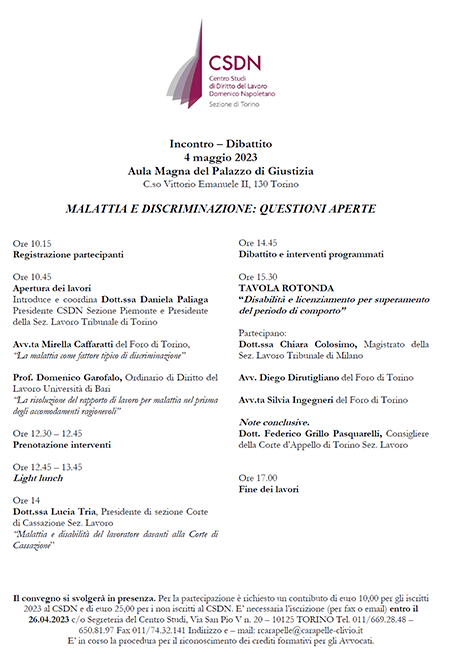 Da Gio, 04/05/2023 a Gio, 04/05/2023 Mode On-site-only File Programma105.97 KB 13/04/2023 Malattia e discriminazione: questioni aperte on-site only h. 10:15 | C.so Vittorio Emanuele II 130, Torino CSDN - Sezione di Torino Incontro – Dibattito Aula Magna del Palazzo di Giustizia C.so Vittorio Emanuele II, 130 Torino