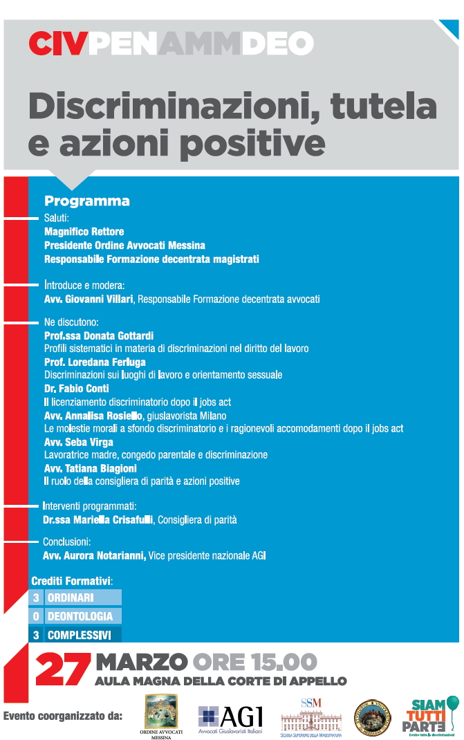 Da Lun, 27/03/2017 a Lun, 27/03/2017 Mode On-site-only 14/11/2022 MESSINA - Discriminazioni, tutela e azioni positive on-site only | Corte d'Appello - ore 15