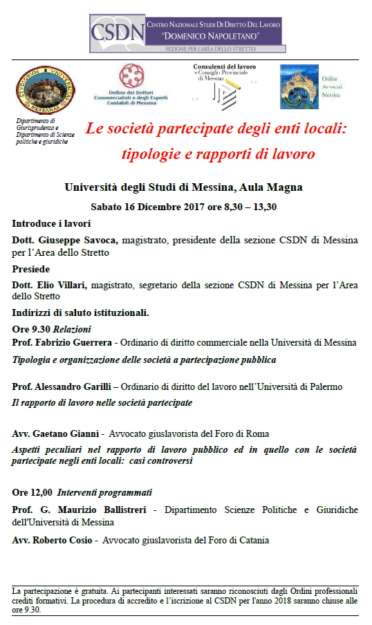 Da Sab, 16/12/2017 a Sab, 16/12/2017 Mode On-site-only 14/11/2022 MESSINA - Le società partecipate degli enti locali: tipologie e rapporti di lavoro on-site only | Aula Magna - ore 8.30