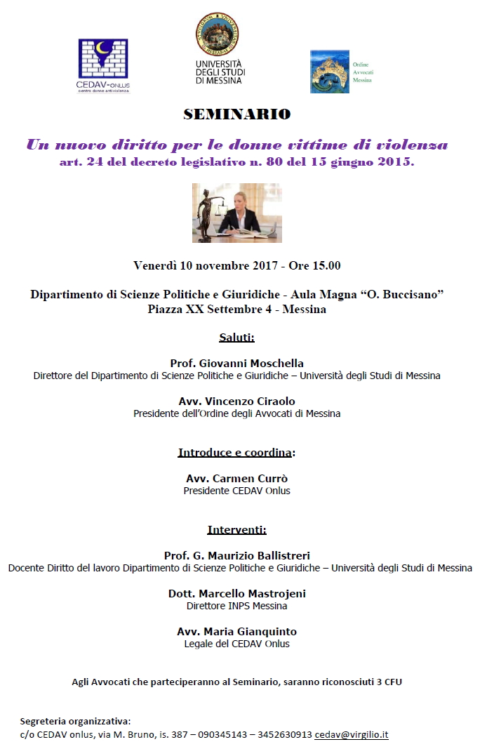 Da Ven, 10/11/2017 a Ven, 10/11/2017 Mode On-site-only 14/11/2022 MESSINA - Un nuovo diritto per le donne vittime di violenza | art. 24 del decreto legislativo n. 80 del 15 giugno 2015 on-site only | Piazza XX Settembre 4 - ore 15