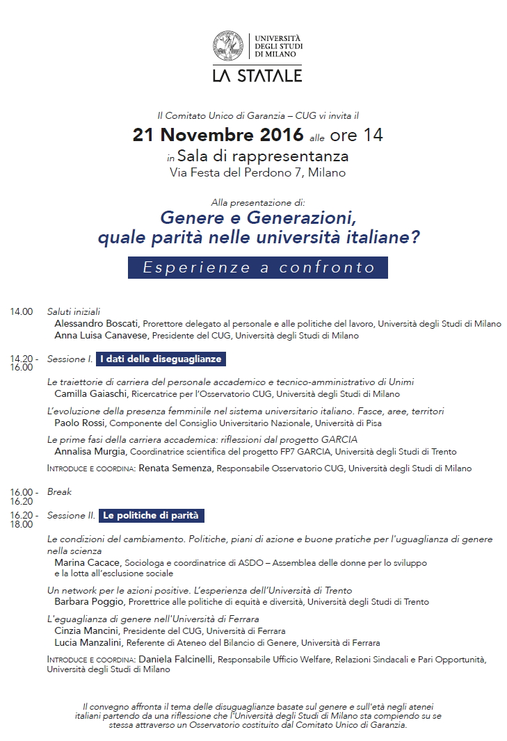 Da Lun, 21/11/2016 a Lun, 21/11/2016 Mode On-site-only 14/11/2022 MILANO - Genere e Generazioni, quale parità nelle università italiane? Esperienze a confronto on-site only | Via Festa del Perdono, 7 - ore 14