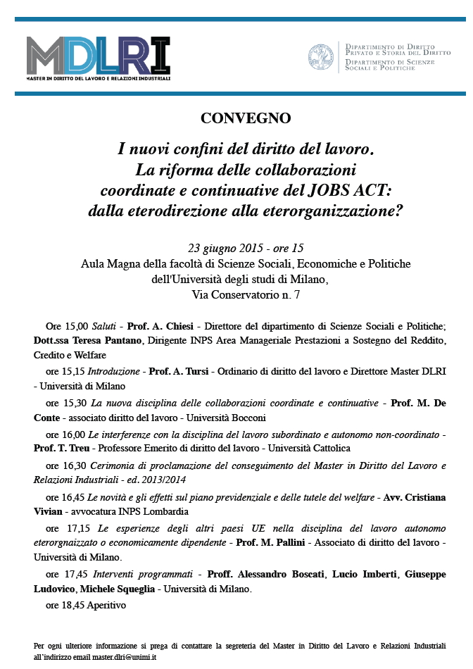 MILANO - I nuovi confini del diritto del lavoro. La riforma delle collaborazioni coordinate e continuative del JOBS ACT: dalla eterodirezione alla eterorganizzazione?