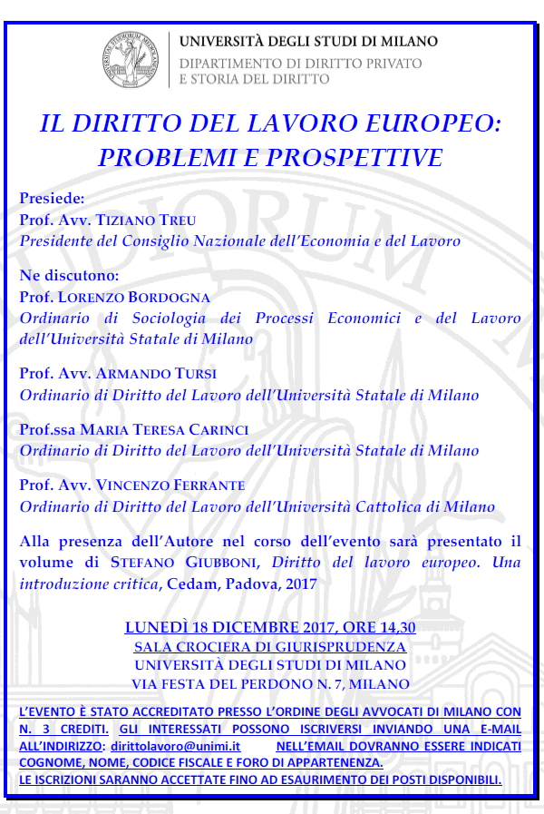 Da Lun, 18/12/2017 a Lun, 18/12/2017 Mode On-site-only 14/11/2022 MILANO - Il diritto del lavoro europeo: problemi e prospettive on-site only | Via Festa del perdono, 7 - ore 14.30