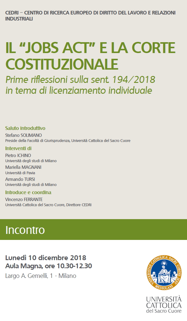 Da Lun, 10/12/2018 a Lun, 10/12/2018 Mode On-site-only 14/11/2022 MILANO - Il "Jobs Act" e la Corte costituzionale. Prime riflessioni sulla sent. 194/2018 in tema di licenziamento individuale on-site only | Largo A. Gemelli, 1 - ore 10.30