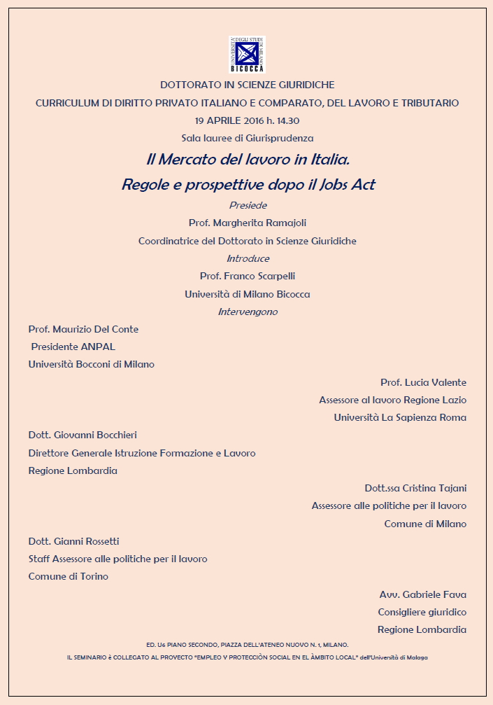 Da Mar, 19/04/2016 a Mar, 19/04/2016 Mode On-site-only 14/11/2022 MILANO - Il Mercato del lavoro in Italia. Regole e prospettive dopo il Jobs Act on-site only | Piazza dell'Ateneo nuovo, 1 - ore 14.30