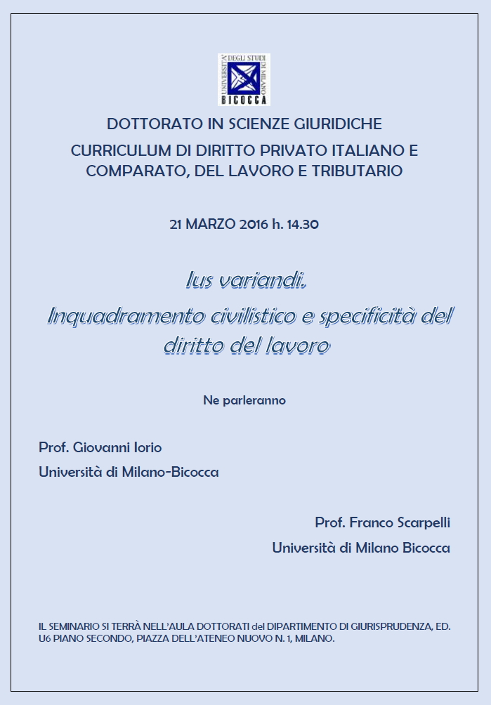 Da Lun, 21/03/2016 a Lun, 21/03/2016 Mode On-site-only 14/11/2022 MILANO - Ius variandi. Inquadramento civilistico e specificità del diritto del lavoro. on-site only | Piazza dell'Ateneo Nuovo, 1 - ore 14.30