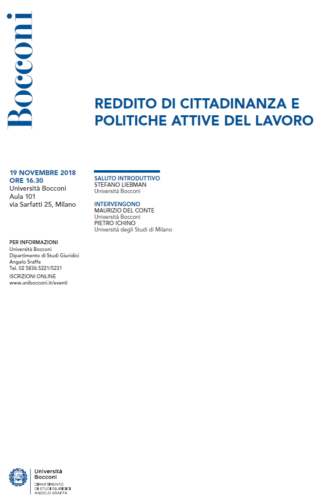 Da Lun, 19/11/2018 a Lun, 19/11/2018 Mode On-site-only 14/11/2022 MILANO - Reddito di cittadinanza e politiche attive del lavoro on-site only | Via Sarfatti, 25 - ore 16.30