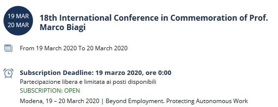 Da Gio, 19/03/2020 a Gio, 19/03/2020 Mode On-site-only 14/11/2022 MODENA - 18th International Conference in Commemoration of Prof. Marco Biagi | RINVIATO al 29-30 ottobre 2020 on-site only | RINVIATO AL29-30 OTTOBRE 2020