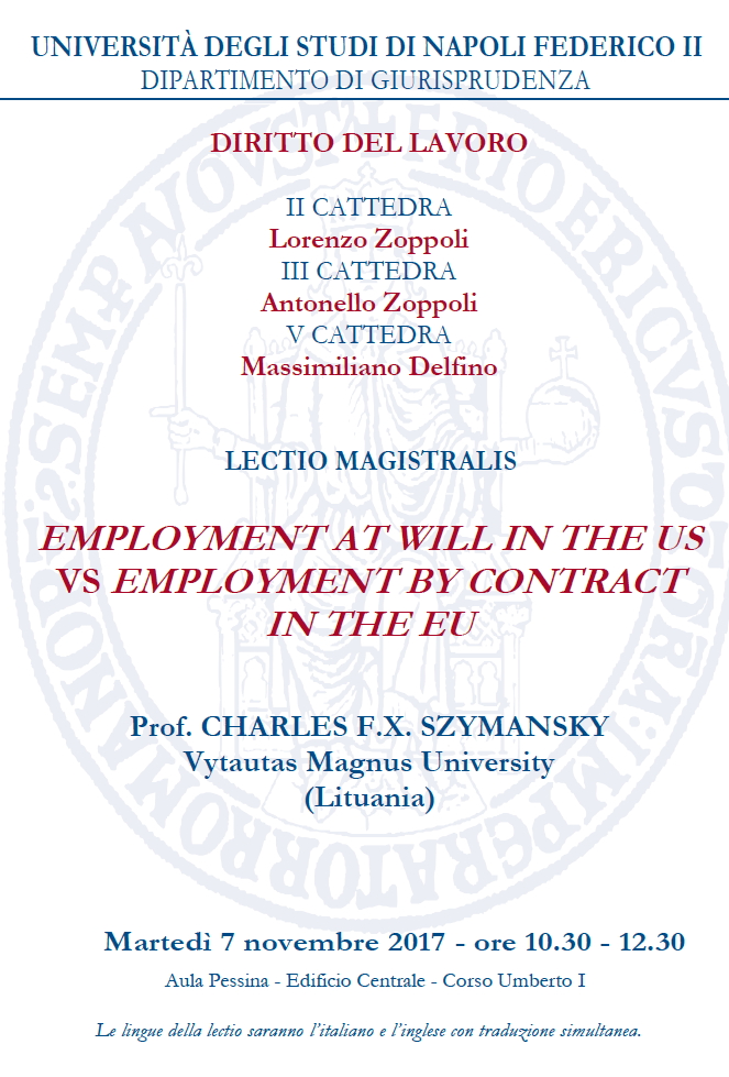 Da Mar, 07/11/2017 a Mar, 07/11/2017 Mode On-site-only 14/11/2022 NAPOLI - Employment at will in the US vs Employment by contract in the EU on-site only | Corso Umberto I - ore 10.30