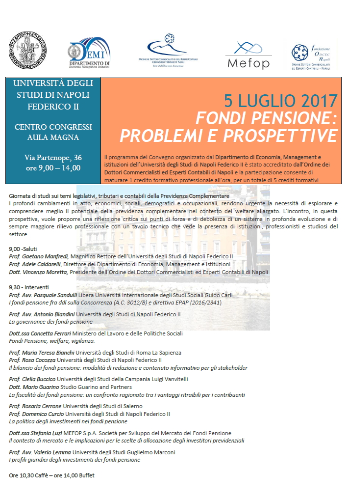 Da Mer, 05/07/2017 a Mer, 05/07/2017 Mode On-site-only 14/11/2022 NAPOLI - Fondi pensione: problemi e prospettive on-site only | Via Partenope, 36 - ore 9