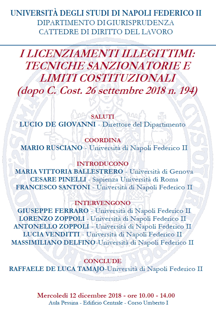NAPOLI - I licenziamenti illegittimi: tecniche sanzionatorie e limiti costituzionali (dopo C. Cost. 26 settembre 2018 n. 194)