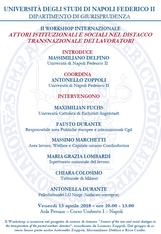 Da Ven, 13/04/2018 a Ven, 13/04/2018 Mode On-site-only 14/11/2022 NAPOLI - II Workshop Internazionale | Attori istituzionali e sociali nel distacco transnazionale dei lavoratori on-site only | Corso Umberto I - ore 10