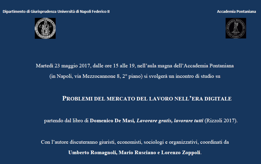 Da Mar, 23/05/2017 a Mar, 23/05/2017 Mode On-site-only 14/11/2022 NAPOLI - Problemi del mercato del lavoro nell'era digitale on-site only | Via Mezzocannone, 8 - ore 15