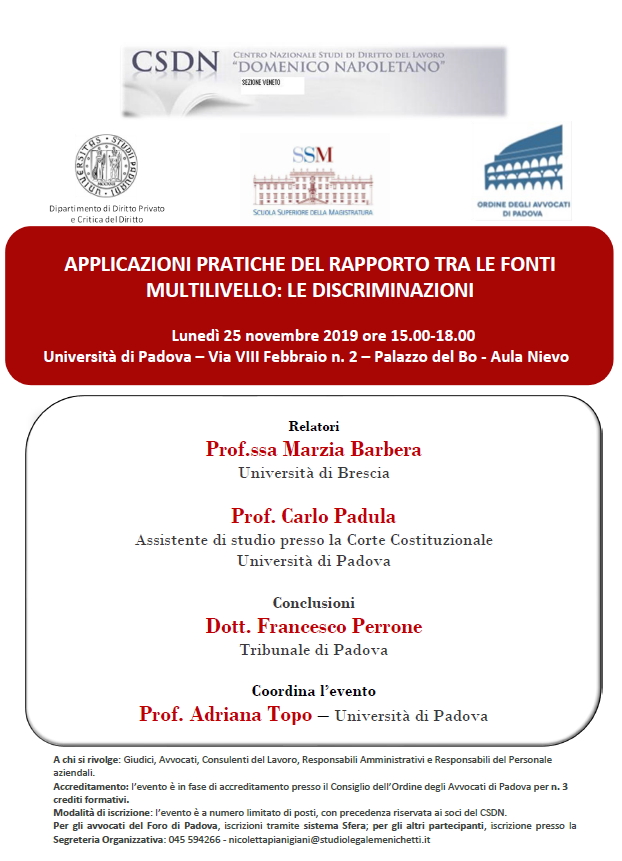 PADOVA - Applicazioni pratiche del rapporto tra le fonti multilivello: le discriminazioni