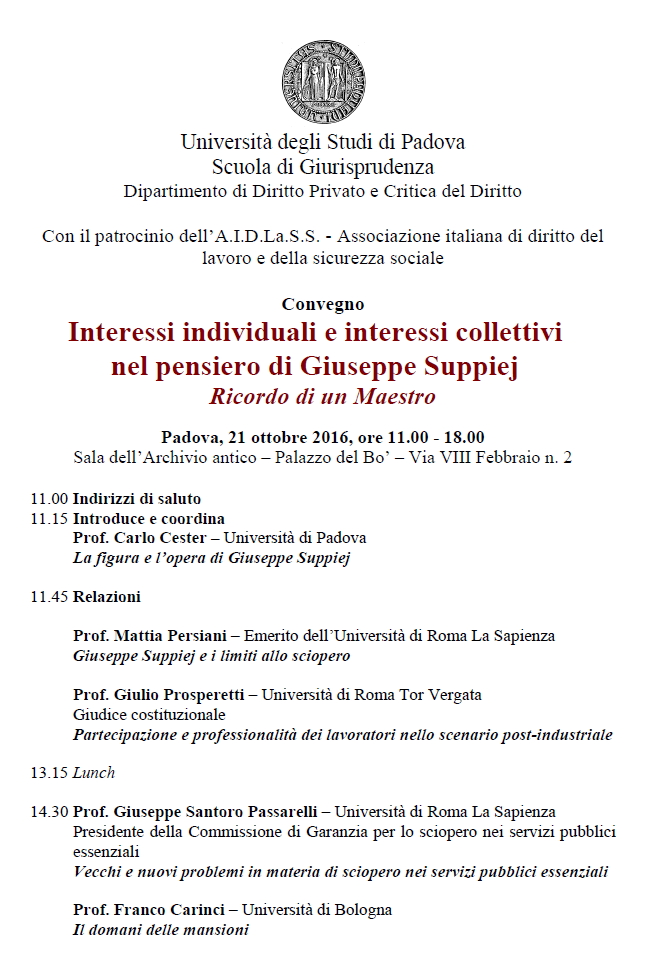 Da Ven, 21/10/2016 a Ven, 21/10/2016 Mode On-site-only 14/11/2022 PADOVA - Interessi individuali e interessi collettivi nel pensiero di Giuseppe Suppiej | Ricordo di un Maestro on-site only | Via VIII Febbraio, 2 - ore 11