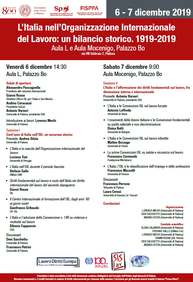 PADOVA - L’Italia nell’Organizzazione Internazionale del Lavoro: un bilancio storico. 1919-2019 (6-7 dicembre 2019)