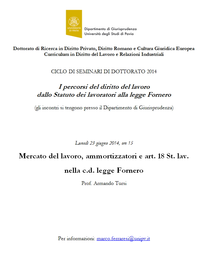 Da Lun, 23/06/2014 a Lun, 23/06/2014 Mode On-site-only 14/11/2022 PAVIA - Mercato del lavoro, ammortizzatori e art. 18 St. lav. nella c.d. legge Fornero. Seminario del prof. A. Tursi on-site only | Dip. di Giurisprudenza - 15.00