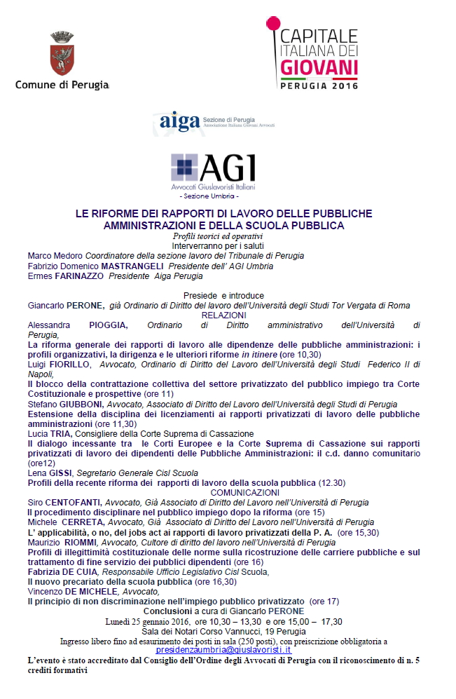 Da Lun, 25/01/2016 a Lun, 25/01/2016 Mode On-site-only 14/11/2022 PERUGIA - Le riforme dei rapporti di lavoro delle pubbliche amministrazioni e della scuola pubblica on-site only | Sala dei Notari Corso Vannucci, 19 - ore 15