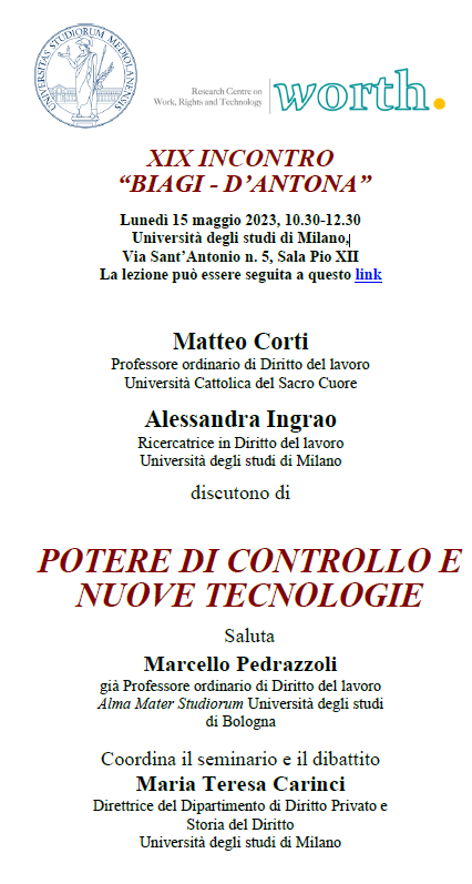 Da Lun, 15/05/2023 a Lun, 15/05/2023 Mode Hybrid File Programma144.71 KB 20/04/2023 Potere di controllo e nuove tecnologie hybrid h. 10.30 Università degli studi di Milano, Via Sant’Antonio n. 5, Sala Pio XII La lezione può essere seguita a questo link