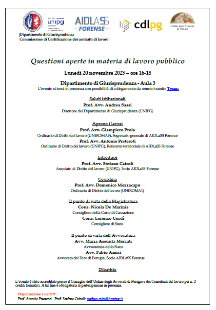 L’evento è stato accreditato presso il Consiglio dell’Ordine degli Avvocati di Perugia e dei Consulenti del lavoro per n. 2 crediti formativi. A tal fine è obbligatoria la  partecipazione in presenza.