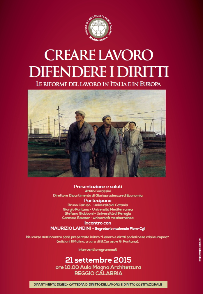 Da Lun, 21/09/2015 a Lun, 21/09/2015 Mode On-site-only 14/11/2022 REGGIO CALABRIA - Creare lavoro. Difendere i diritti - Le riforme del lavoro in Italia e in Europa on-site only | Aula Magna Architettura - ore 10