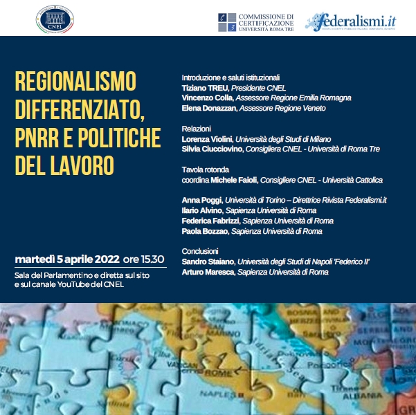 Da Mar, 05/04/2022 a Mar, 05/04/2022 Mode Hybrid File (download locandina)714.09 KB 29/03/2022 Regionalismo differenziato, PNRR e politiche del lavoro hybrid h. 15.30 Sala del Parlamentino e diretta sul sito e sul canale YouTube del CNEL