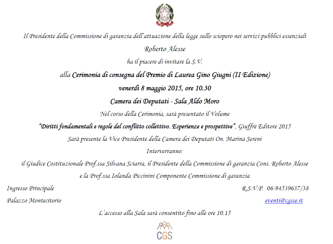 Da Ven, 08/05/2015 a Ven, 08/05/2015 Mode On-site-only 14/11/2022 ROMA - Cerimonia di consegna del Premio di Laurea Gino Giugni (II Edizione) on-site only | Camera dei Deputati - 10.30 (