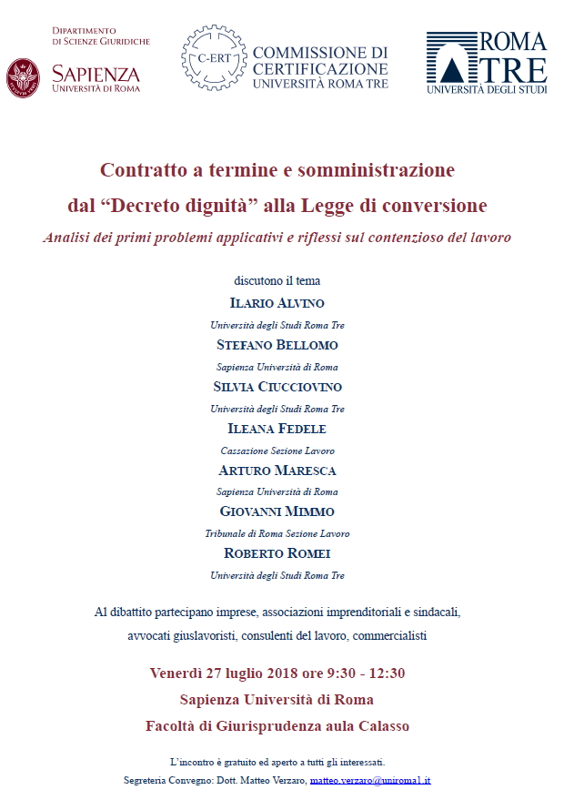 ROMA - Contratto a termine e somministrazione dal “Decreto dignità” alla Legge di conversione - Analisi dei primi problemi applicativi e riflessi sul contenzioso del lavoro