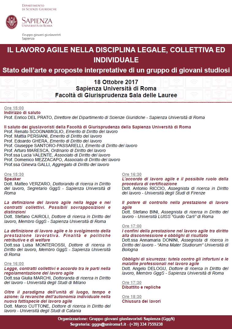 Da Mer, 18/10/2017 a Mer, 18/10/2017 Mode On-site-only 14/11/2022 ROMA - Il lavoro agile nella disciplina legale, collettiva ed individuale | Stato dell'arte e proposte interpretative di un gruppo di giovani studiosi on-site only | Facoltà di Giurisprudenza Sala delle Lauree - ore 15