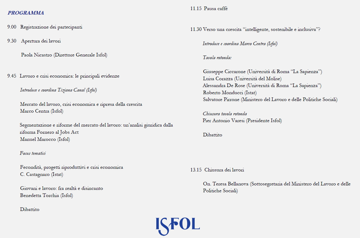 Da Gio, 10/12/2015 a Gio, 10/12/2015 Mode On-site-only 14/11/2022 ROMA - Lavoro e crisi economica: evidenze, riforme e prospettive on-site only | Corso d’Italia 33 - ore 9