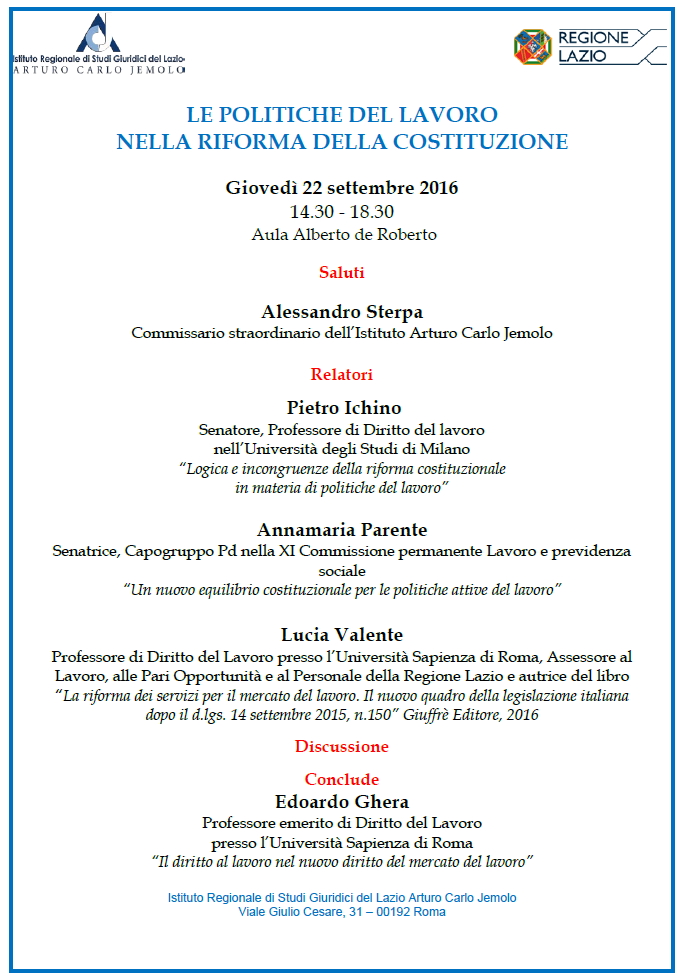 Da Gio, 22/09/2016 a Gio, 22/09/2016 Mode On-site-only 14/11/2022 ROMA - Le politiche del lavoro nella riforma della Costituzione on-site only | Viale Giulio Cesare, 31 - 14.30