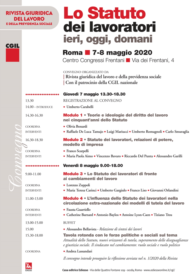 Da Gio, 07/05/2020 a Gio, 07/05/2020 Mode On-site-only 14/11/2022 ROMA - Lo Statuto dei lavoratori ieri, oggi, domani (7-8 maggio 2020) - RINVIATO on-site only | Via dei Frentani, 4 - ore 13.30 RINVIATO