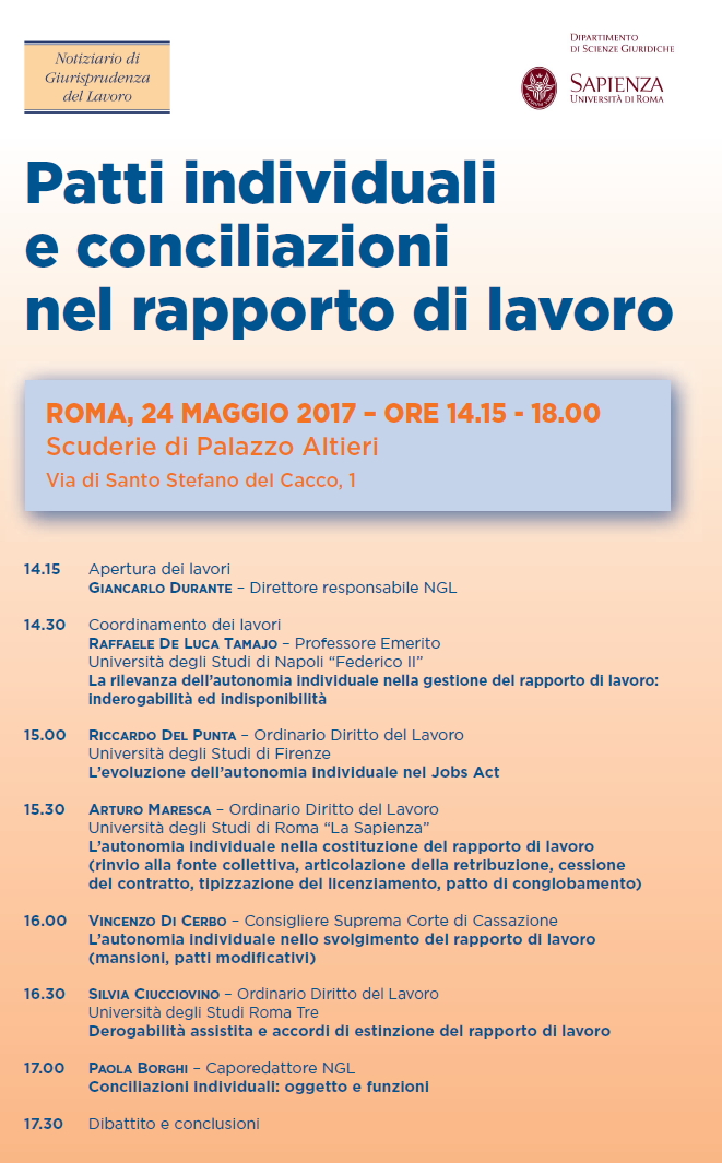 Da Mer, 24/05/2017 a Mer, 24/05/2017 Mode On-site-only 14/11/2022 ROMA - Patti individuali e conciliazioni nel rapporto di lavoro on-site only | Via di Santo Stefano del Cacco, 1 - ore 14:15