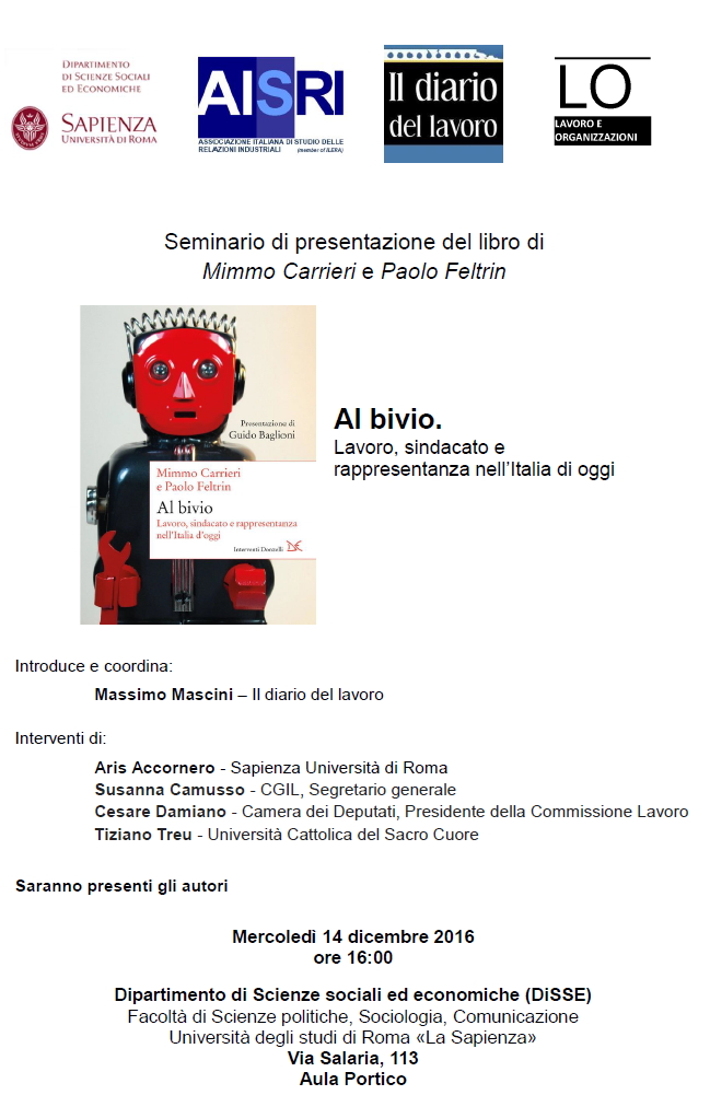 Da Mer, 14/12/2016 a Mer, 14/12/2016 Mode On-site-only 14/11/2022 ROMA - Presentazione del libro "Al bivio. Lavoro, sindacato e rappresentanza nell’Italia di oggi" on-site only | Via Salaria, 113 - ore 16