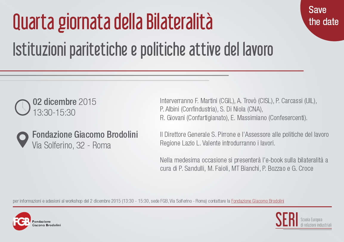 Da Mer, 02/12/2015 a Mer, 02/12/2015 Mode On-site-only 14/11/2022 ROMA - Quarta giornata della Bilateralità | Istituzioni paritetiche e politiche attive del lavoro on-site only | Via Solferino, 32 - ore 13:30
