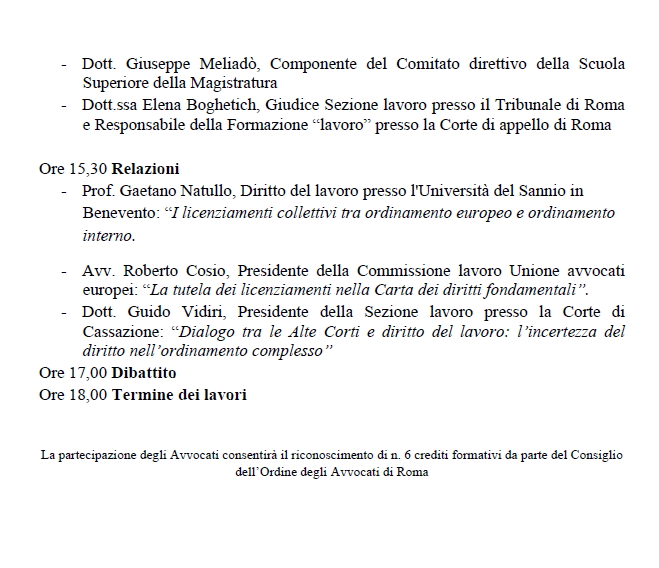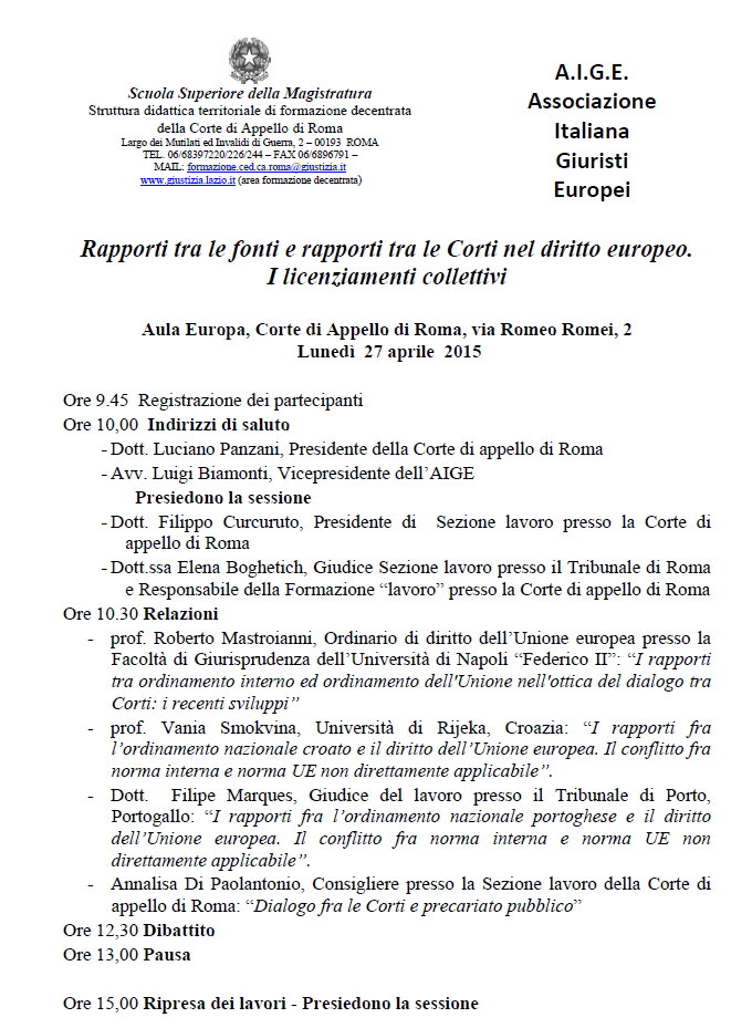 ROMA - Rapporti tra le fonti e rapporti tra le Corti nel diritto europeo. I licenziamenti collettivi
