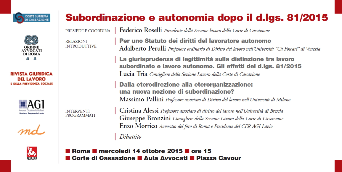 Da Mer, 14/10/2015 a Mer, 14/10/2015 Mode On-site-only 14/11/2022 ROMA - Subordinazione e autonomia dopo il d.lgs. 81/2015 on-site only | Piazza Cavour - 15:00 Per partecipare è necessario inviare una mail a rgl@ediesseonline.it entro il 10 ottobre