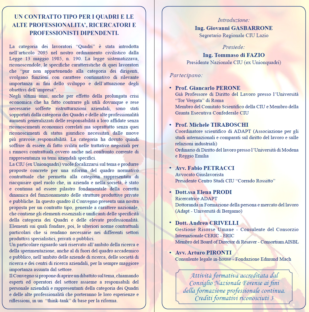 Da Ven, 31/03/2017 a Ven, 31/03/2017 Mode On-site-only 14/11/2022 ROMA - Un contratto tipo per i Quadri e le Alte Professionalità, Ricercatori e Professionisti dipendenti on-site only | Viale David Lubin, 2 - ore 9.30