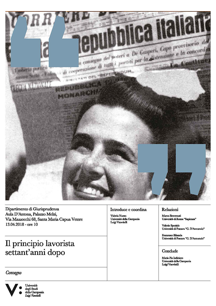 Da Ven, 13/04/2018 a Ven, 13/04/2018 Mode On-site-only 14/11/2022 SANTA MARIA CAPUA VENERE - Il principio lavorista settant'anni dopo on-site only | Via Mazzocchi, 68 - ore 10