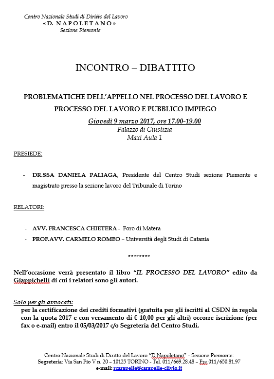 Da Gio, 09/03/2017 a Gio, 09/03/2017 Mode On-site-only 14/11/2022 TORINO - Problematiche dell’appello nel processo del lavoro e processo del lavoro e pubblico impiego on-site only | Palazzo di Giustizia - ore 17