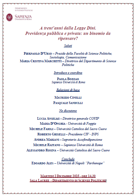 Da Mar, 02/12/2025 a Mar, 02/12/2025 Mode On-site-only File Programma385.91 KB 15/10/2025 A trent’anni dalla Legge Dini. Previdenza pubblica e privata: un binomio da ripensare? on-site only h. 14:30 | Piazzale Aldo Moro 5, Roma Sapienza Università di Roma Sala Lauree - Dipartimento di Scienze Politiche