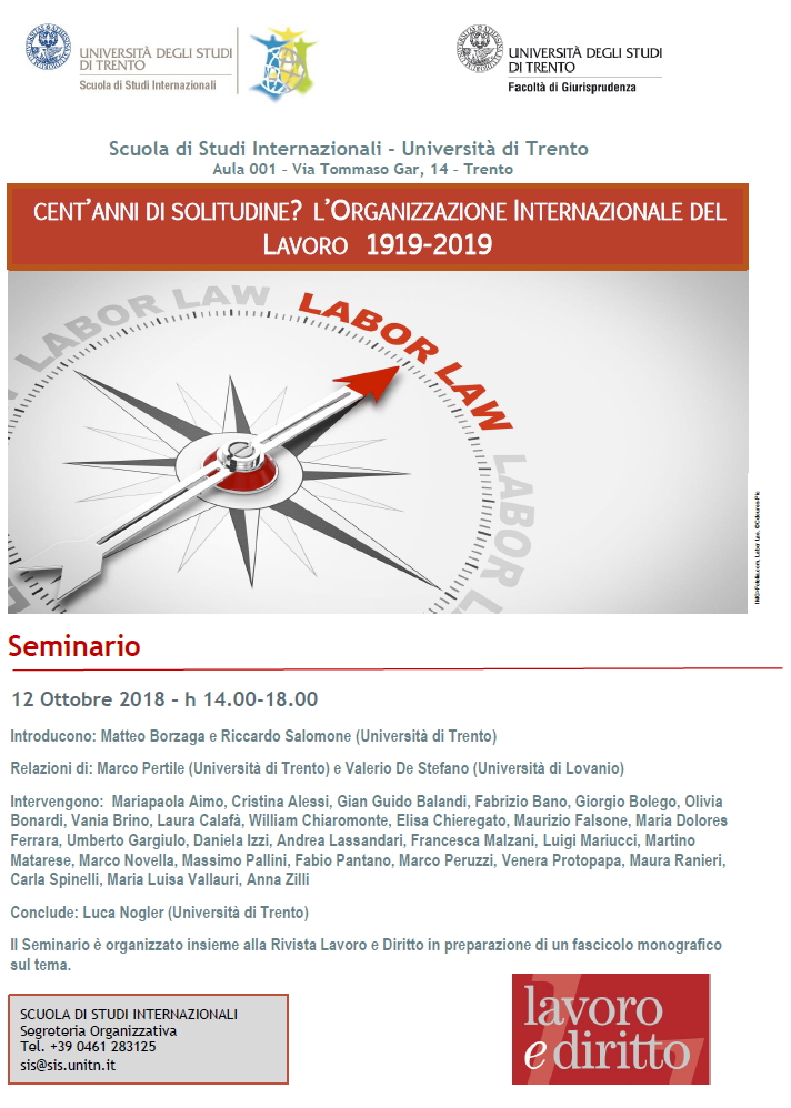 Da Ven, 12/10/2018 a Ven, 12/10/2018 Mode On-site-only 14/11/2022 TRENTO - Cent'anni di solitudine? L'organizzazione internazionale del lavoro 1919-2019 on-site only | Via Tommaso Gar, 14 - ore 14