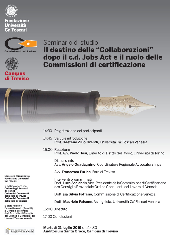 TREVISO - Il destino delle “Collaborazioni” dopo il c.d. Jobs Act e il ruolo delle Commissioni di certificazione