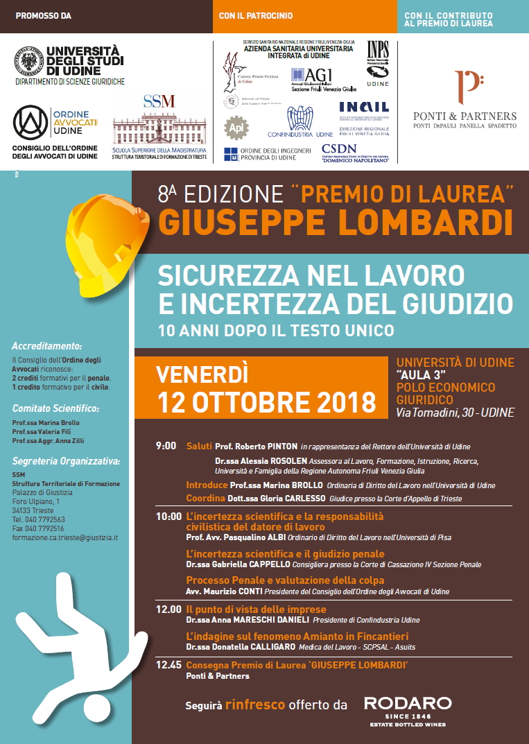 UDINE - VIII° Premio di Laurea "Giuseppe Lombardi" - Sicurezza nel lavoro e incertezza del giudizio. 10 anni dopo il testo unico