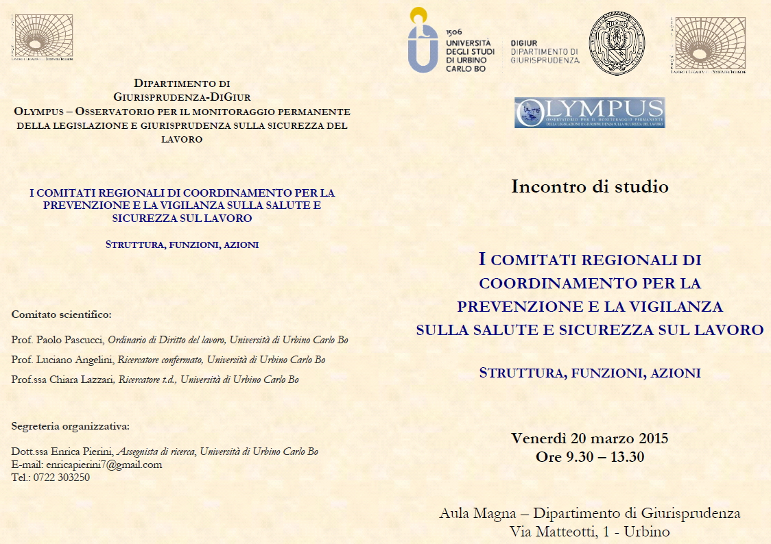 Da Ven, 20/03/2015 a Ven, 20/03/2015 Mode On-site-only 14/11/2022 URBINO - I comitati regionali di coordinamento per la prevenzione e la vigilanza sulla salute e sicurezza sul lavoro on-site only | Via Matteotti, 1 - 9:30