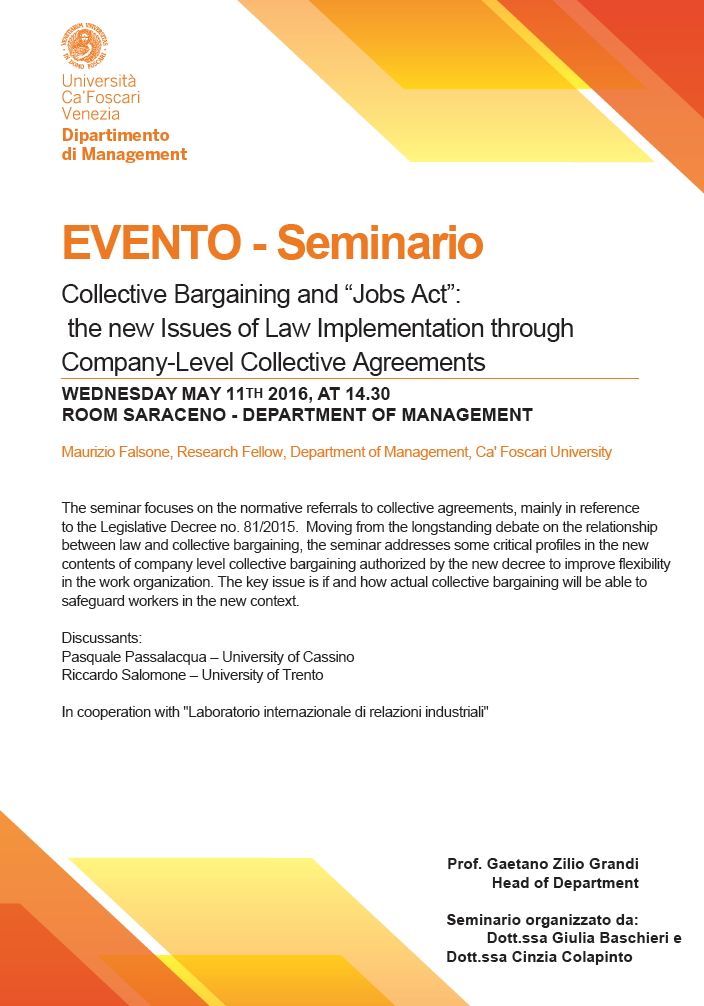 Da Mer, 11/05/2016 a Mer, 11/05/2016 Mode On-site-only 14/11/2022 VENEZIA - Collective Bargaining and “Jobs Act”: the new Issues of Law Implementation through Company-Level Collective Agreements on-site only | San Giobbe - Cannaregio, 873 - ore 14.30 -->