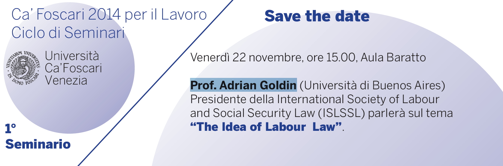 Da Ven, 22/11/2013 a Ven, 22/11/2013 Mode On-site-only 14/11/2022 VENEZIA - The Idea of Labour Law. Seminario del Prof. Adrian Goldin on-site only | niv. Ca' Foscari, aula Baratto - 15,00