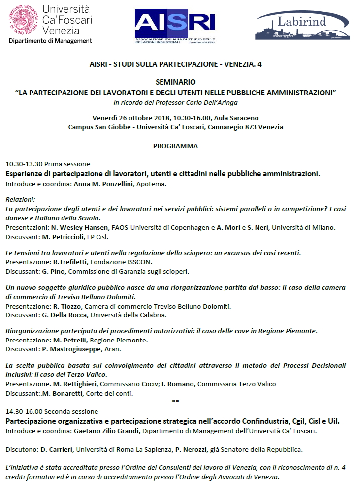 Da Ven, 26/10/2018 a Ven, 26/10/2018 Mode On-site-only 14/11/2022 VENEZIA - La partecipazione dei lavoratori e degli utenti nelle pubbliche amministrazioni on-site only | Aula Saraceno - ore 10.30