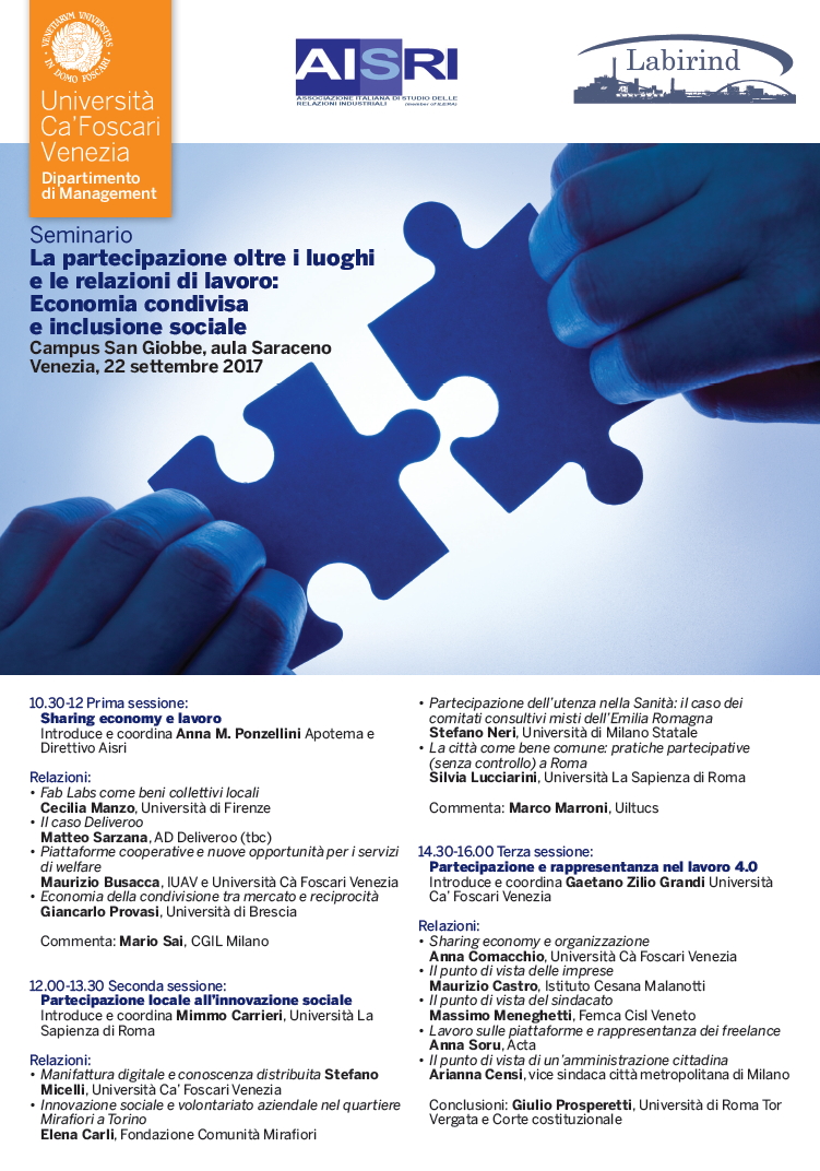 Da Ven, 22/09/2017 a Ven, 22/09/2017 Mode On-site-only 14/11/2022 VENEZIA - La partecipazione oltre i luoghi e le relazioni di lavoro: economia condivisa e inclusione sociale on-site only | Via Cannaregio, 873 - ore 10.30