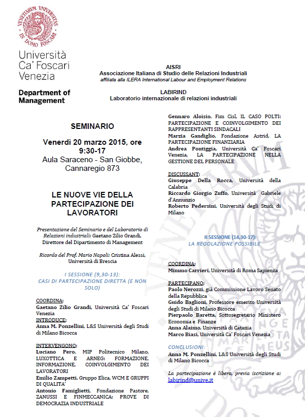 Da Ven, 20/03/2015 a Ven, 20/03/2015 Mode On-site-only 14/11/2022 VENEZIA - Le nuove vie della partecipazione dei lavoratori on-site only | San Giobbe, Cannaregio 873 - 9:30